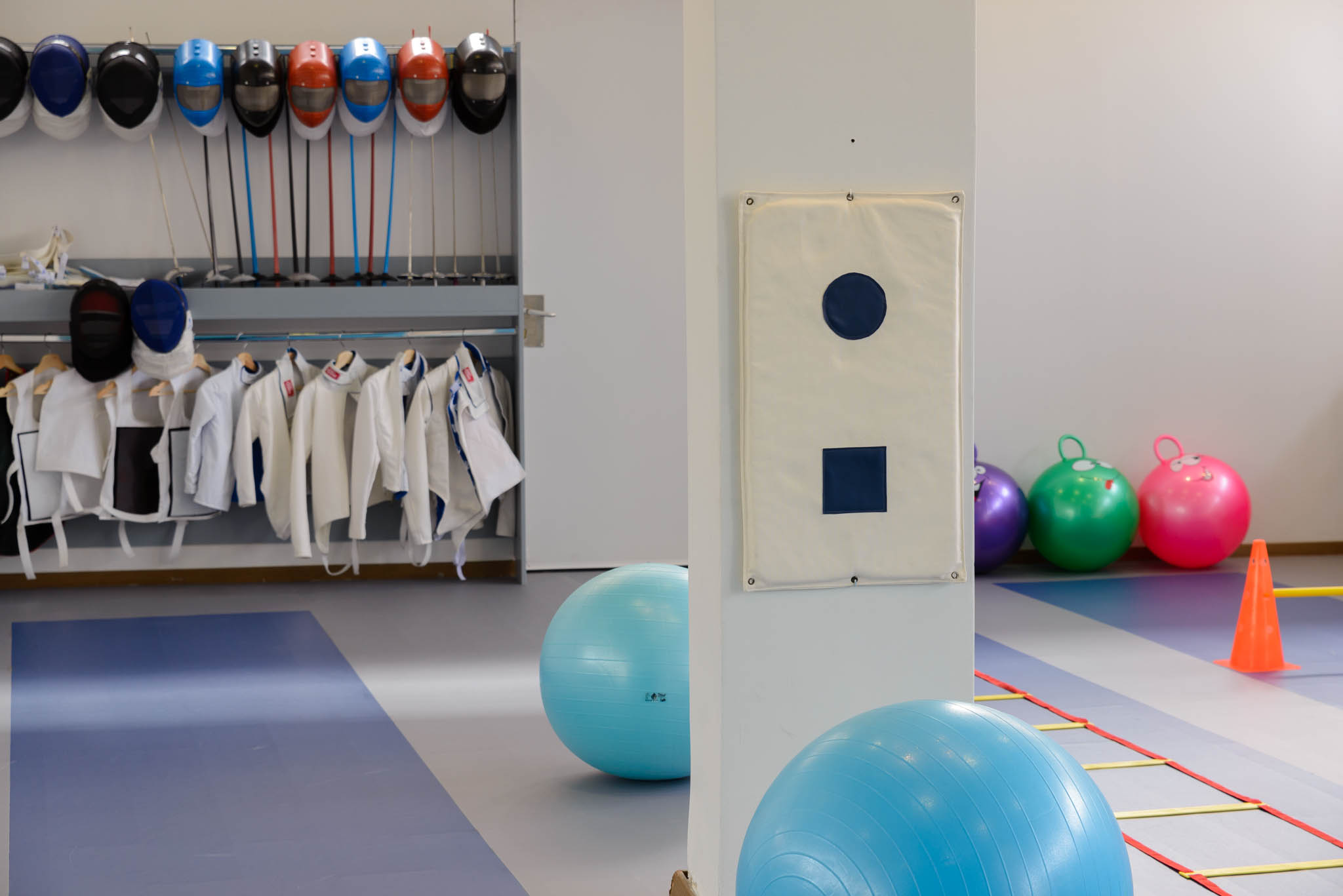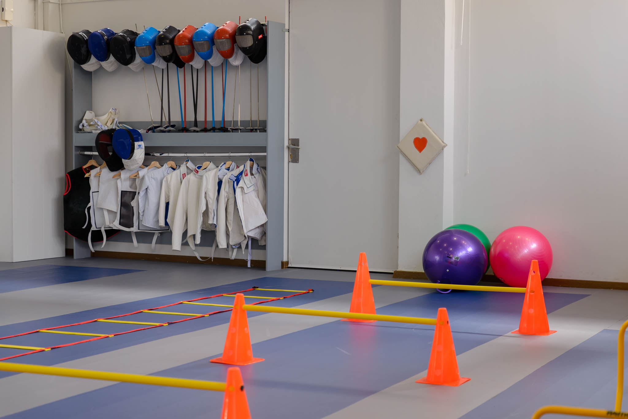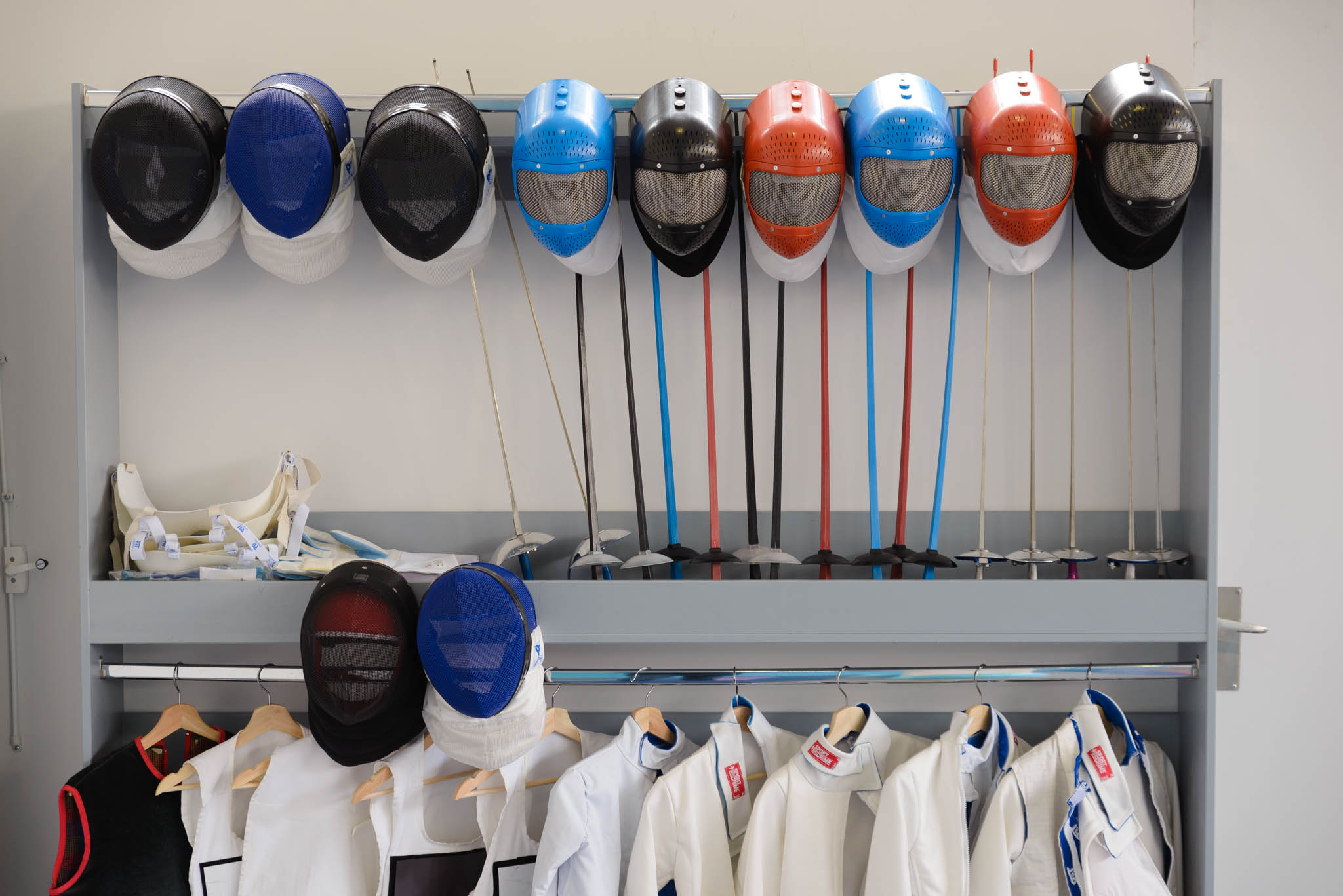 Στο διαμορφωμένο σταντ τοποθετούνται οι μάσκες, τα σπαθιά, οι στολές και τα γάντια , εξοπλισμός που παρέχεται δωρεάν από τον σύλλογο για την προπόνηση των μικρών και μεγάλων αθλητών.